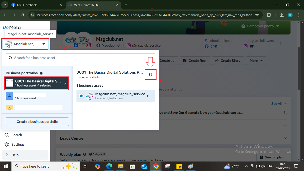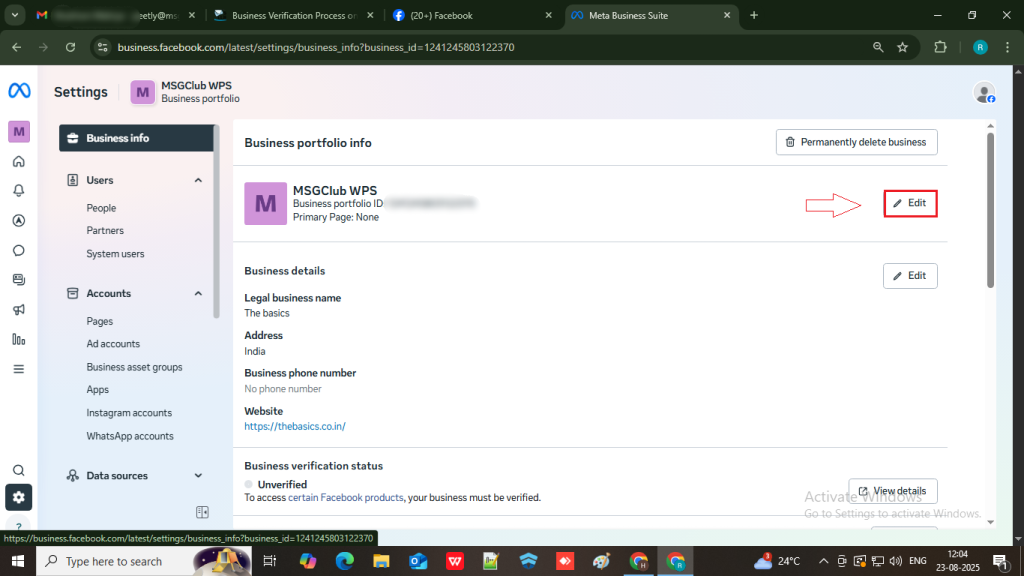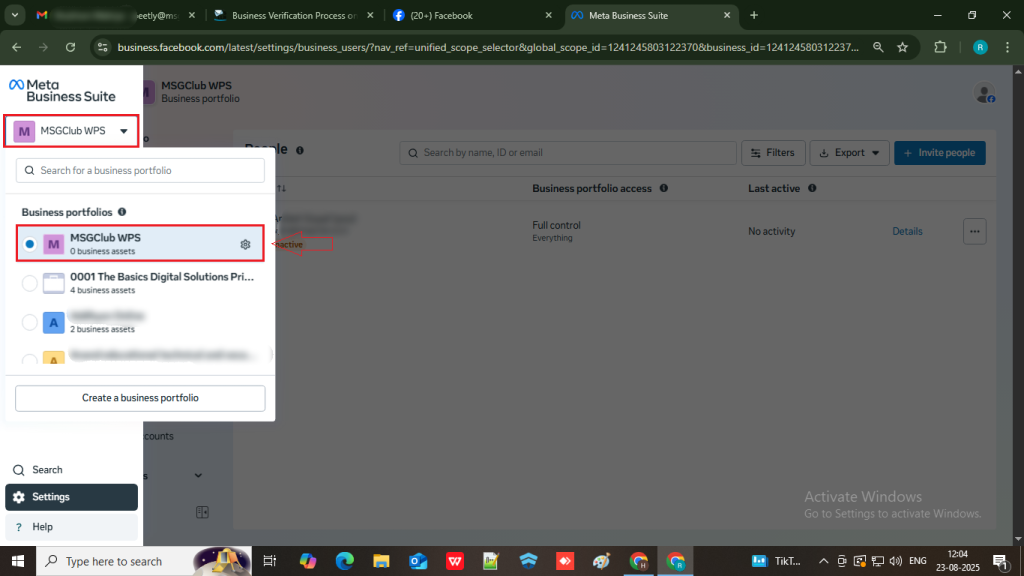 Step 4: Click the drop-down button in the upper left side of the screen and then click on the Settings icon of the business portfolio in which your WABA account is created.