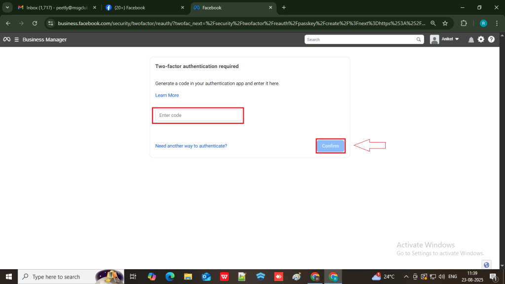Step 15: Meta will send an OTP to your selected method. Enter the OTP in Meta, then click Next.