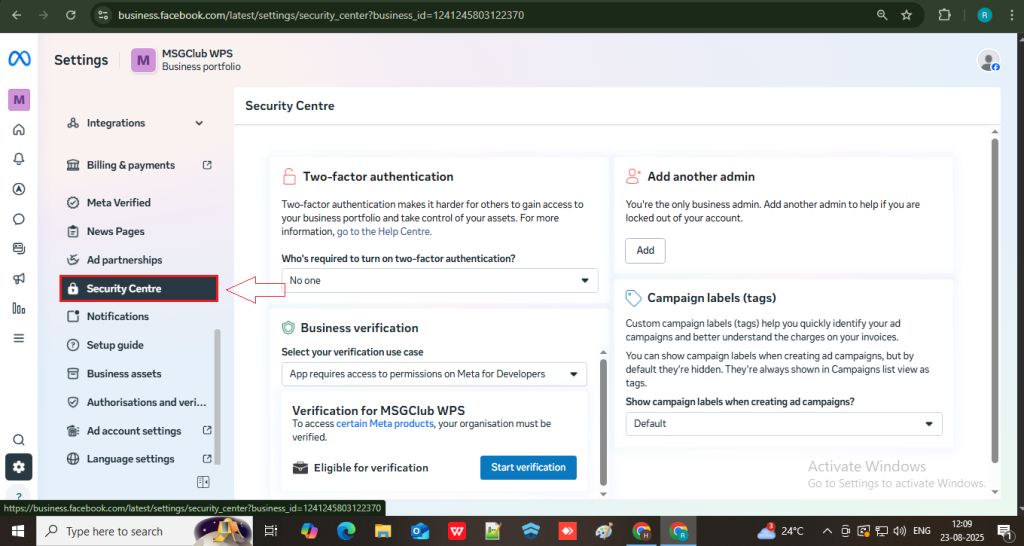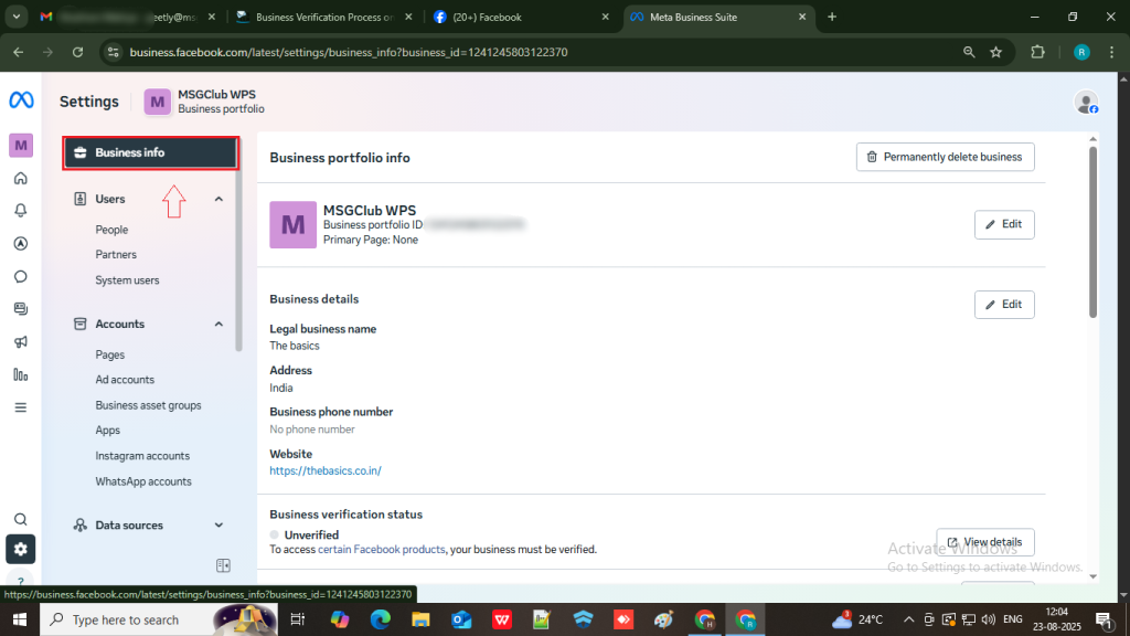 Step 5: The main Meta Business Portfolio page will open. Here on the left side, click on Business Portfolio Info.
