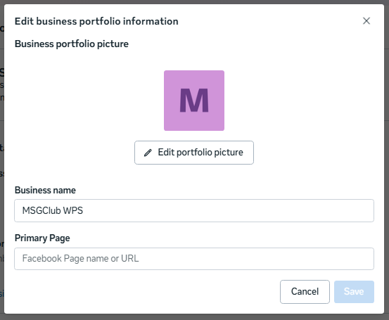 Step 6: Click the first Edit button on the right, enter your business name and the primary Facebook page name or URL, upload your business profile picture, and click Save button.