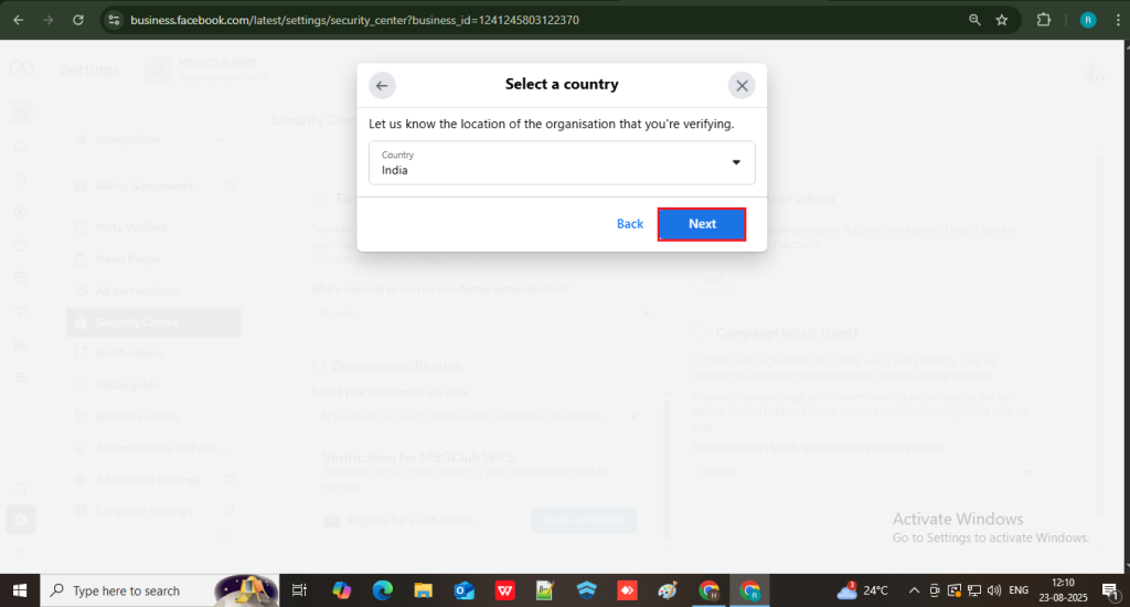 Step 9: Meta will ask for your business type. Select the appropriate business type (This details you can find in the GST ) and click Next.