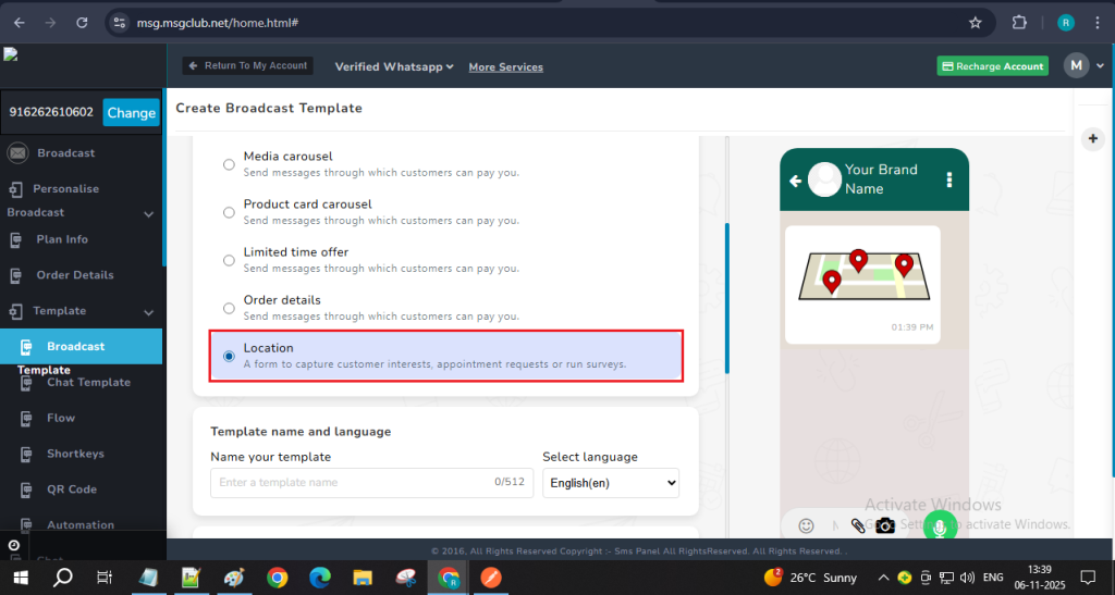 You can share your business location or any chosen location with customers by using the Location option in the Broadcast Template.