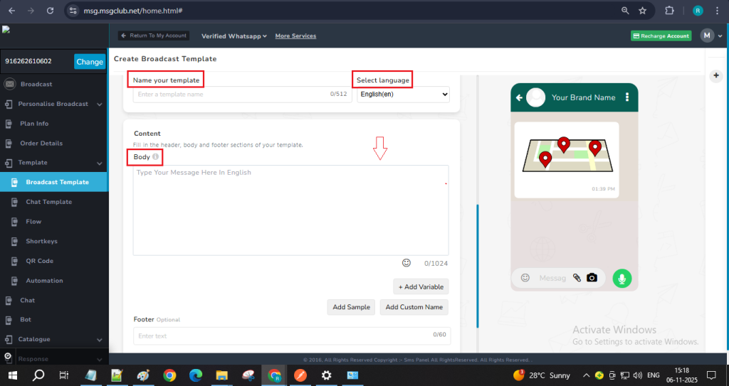 Ans. A Broadcast Template is a pre-approved message format used to send the same message to many customers at once through MsgClub’s Verified WhatsApp Service. Once approved by WhatsApp, you can use it anytime without re-approval.