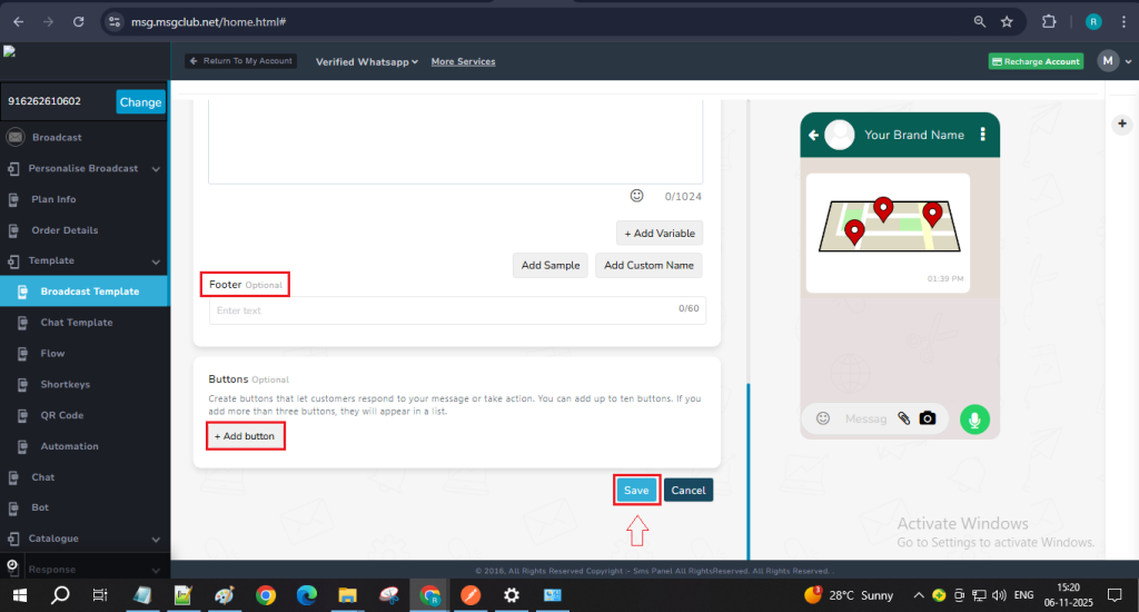Step 7: After filling in all the required details, click the Save button. Your broadcast template will be created and added to the Template List, where its status will appear as “In Review.“