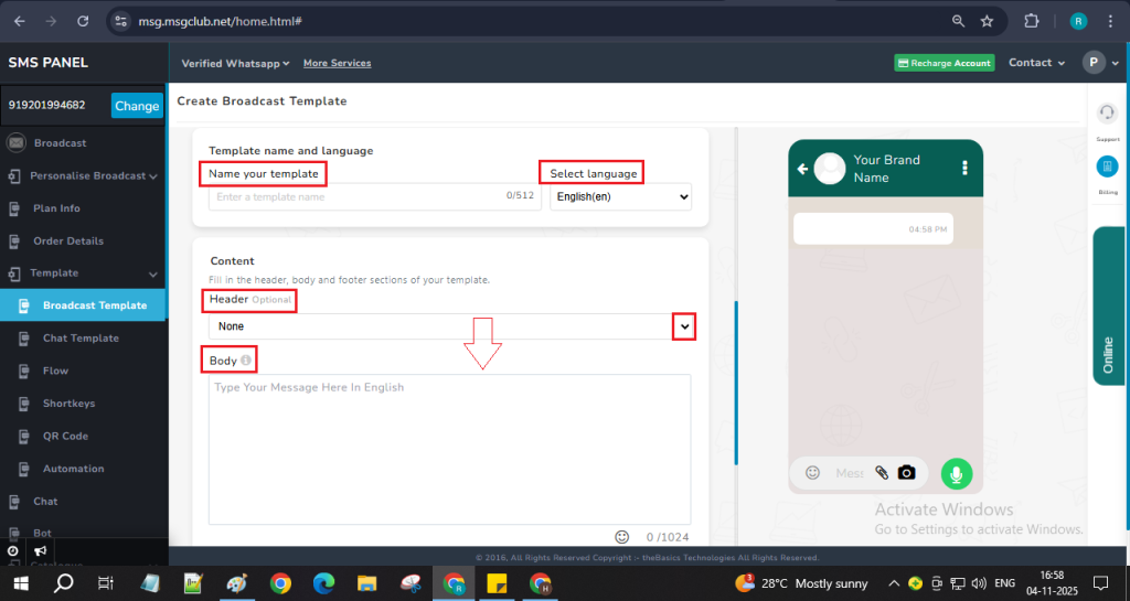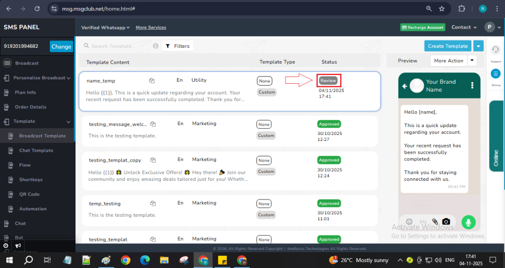 Step 7: After filling in all the required details, click the Save button. Your broadcast template will be created and added to the Template List, where its status will appear as “In Review.”