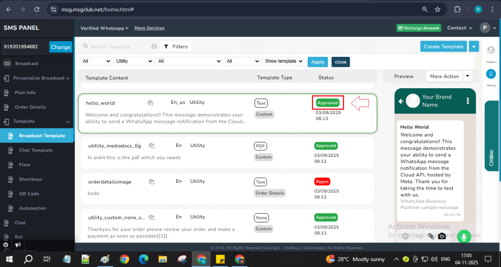 Step 8: After your template status is shown as Approved then you can start sending your WhatsApp messages