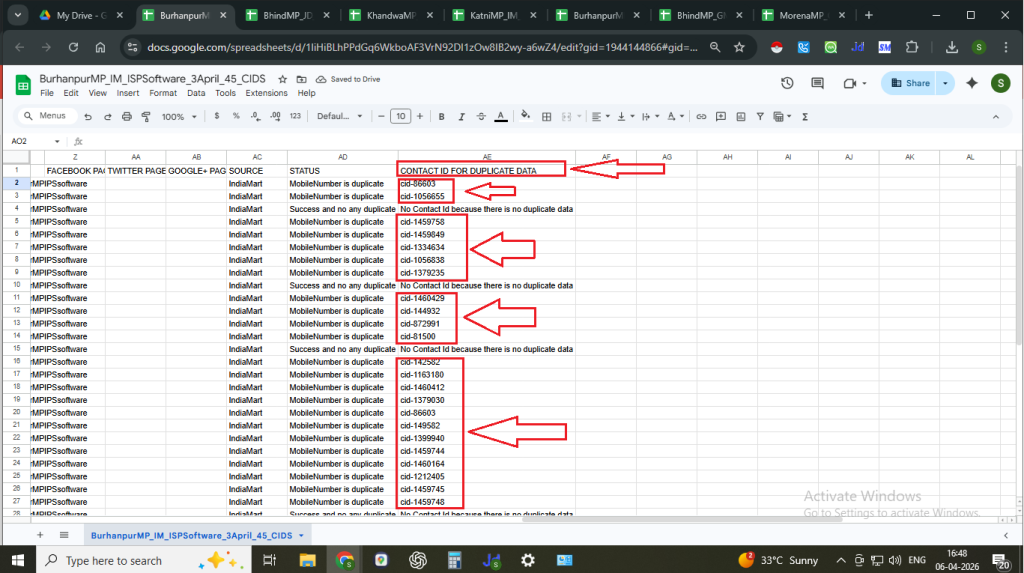 Step 4: Open the file and take the CIDs given in the last column with the name – CONTACT ID FOR DUPLICATE DATA.